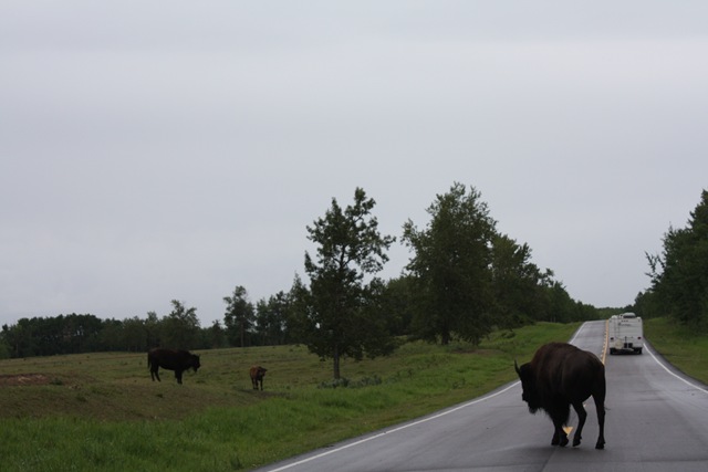 and there are no bears resident to the park so I feel pretty safe camping there. It is so close to Edmonton but so quiet. This morning in the rain as I was leaving the bison were all over the road. It took a few extra minutes to get to the highway but it is fun to drive through a herd of these huge animals that are at relative ease with vehicles.