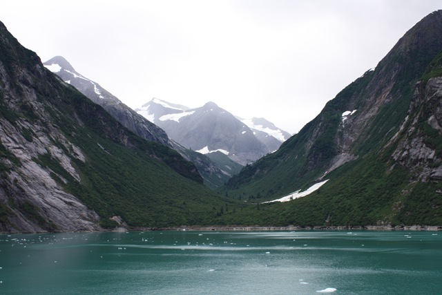The above picture is Part of our trip up to Tracy Arm, a narrow deep fjord.  At the end was a glacier calving icebergs into the sea.