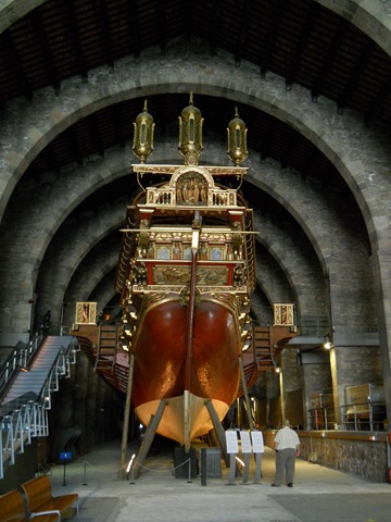 We arrived in Barcelona around 2:45 this afternoon.  It is a long way from Cordoba.  Traveling by high speed train at around 240 Kph it took about four hours.  It is also a lot cooler and the air conditioner in this hotel works a lot better.  We are close to the center of the town – near the port so pretty convenient for a couple of days of sightseeing.  This afternoon we walked a couple blocks to the Maritime museum then went past the statue of Columbus to the wharf and looked out onto the Mediterranean.  Think we may try a short boat trip tomorrow night.  But not in this one.  It took almost 250 rowers to move this one around the sea.